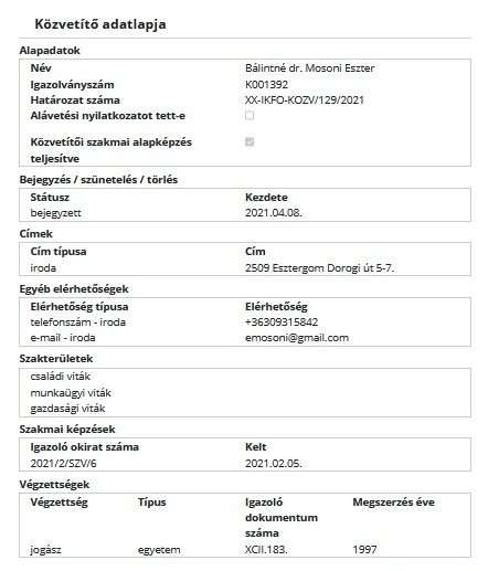 A mediátorok megtalálhatók az Igazságügyi Minisztérium közvetítői névjegyzékében, az én igazolványom száma: K001392.